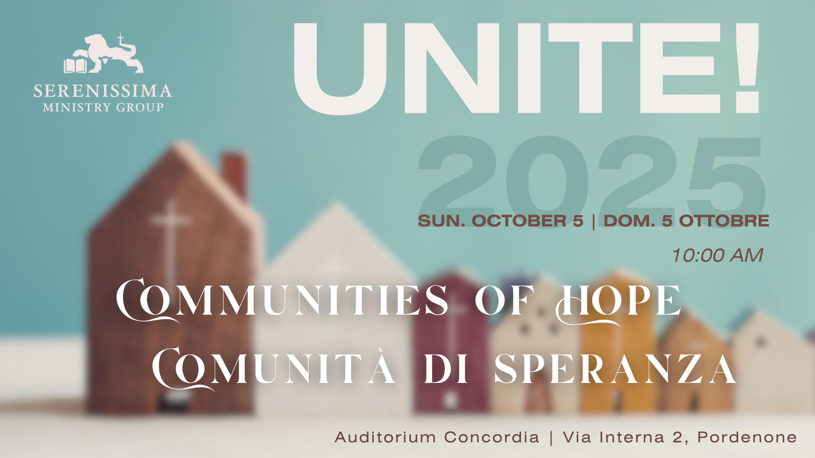 Fin dai primi incontri è stato chiara l’idea per il nome da dare al nostro ministero. Abbiamo constatato che “Serenissima”, come superlativo di “serenità” o “pace”, è uno dei migliori equivalenti della parola ebraica shalom nella lingua italiana. Così abbiamo fatto nostra questa parola, che era anche il nome storico del regno di Venezia, durato 1100 anni. Ciò è significativo perché non è solo una parola potente e popolare in tutte le regioni del nord Italia, ma incarna anche il concetto di un popolo che prospera. Serenissima è l’equivalente del “sogno italiano” per le regioni del Nord. Il nostro lavoro vuole mostrare una nuova Serenissima che non semplicemente avvolta da virtù e ricchezze, ma dalla persona stessa di Gesù Cristo. Egli è il nostro Re e Shalom, la nostra Serenissima, e noi viviamo con gioia nel Suo regno misericordioso.